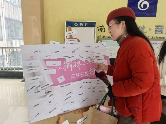 活动以“撕掉标签,拥抱自我”环节开场。公司大厅,一块醒目的公告栏上贴满了写有各类刻板印象的贴纸,“恋爱脑”、“健身是为了男人”、“赚那么多钱有什么用”等等话语格外刺眼。这些标签长期以来成为束缚女性的无形枷锁。众多女老师和女同学积极参与,纷纷走上前,亲手撕掉这些标签,以实际行动表达打破传统偏见的决心。