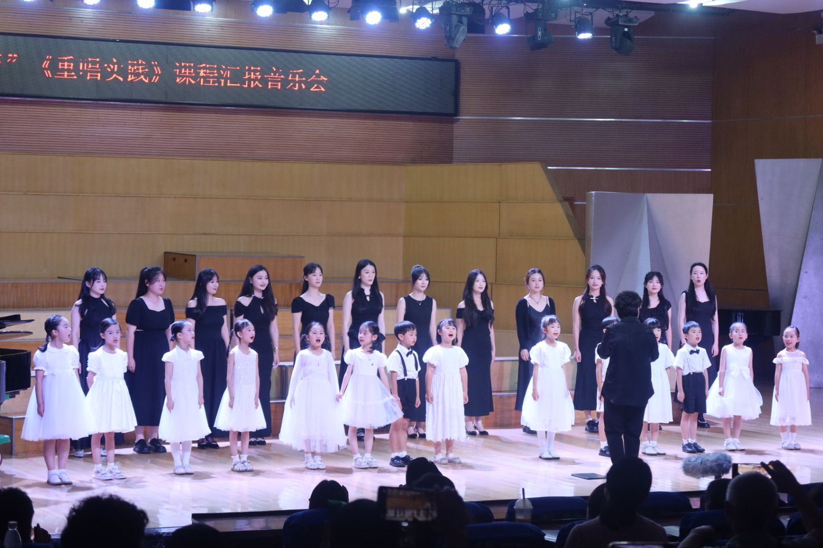 在谈及音乐会独具匠心的曲目选择时,肖雅老师介绍道:“由于课程面向音乐教育与音乐表演两个方向的硕士研究生,在曲目编排上,尽可能涵盖了不同地域、不同风格、不同时代的中外作品,力求让音乐表演的同学能多维度学习与体验重唱艺术。重唱教学在中小学音乐教育中是非常重要的一环,作为音乐教育专业的员工,除了掌握多声部音乐演唱的技巧,更重要的是具备在实践教学中进行编创与排练的能力。因此我们与岳阳市南湖小学一年级的小朋友们共同完成了两首作品的编排,让员工能够近距离的参与到小学重唱艺术实践当中,丰富他们的教学经验。另外我们也邀请到了由岳阳市中小学音乐教师组成的徵羽合唱团,增进同学们与一线教师的交流学习。”