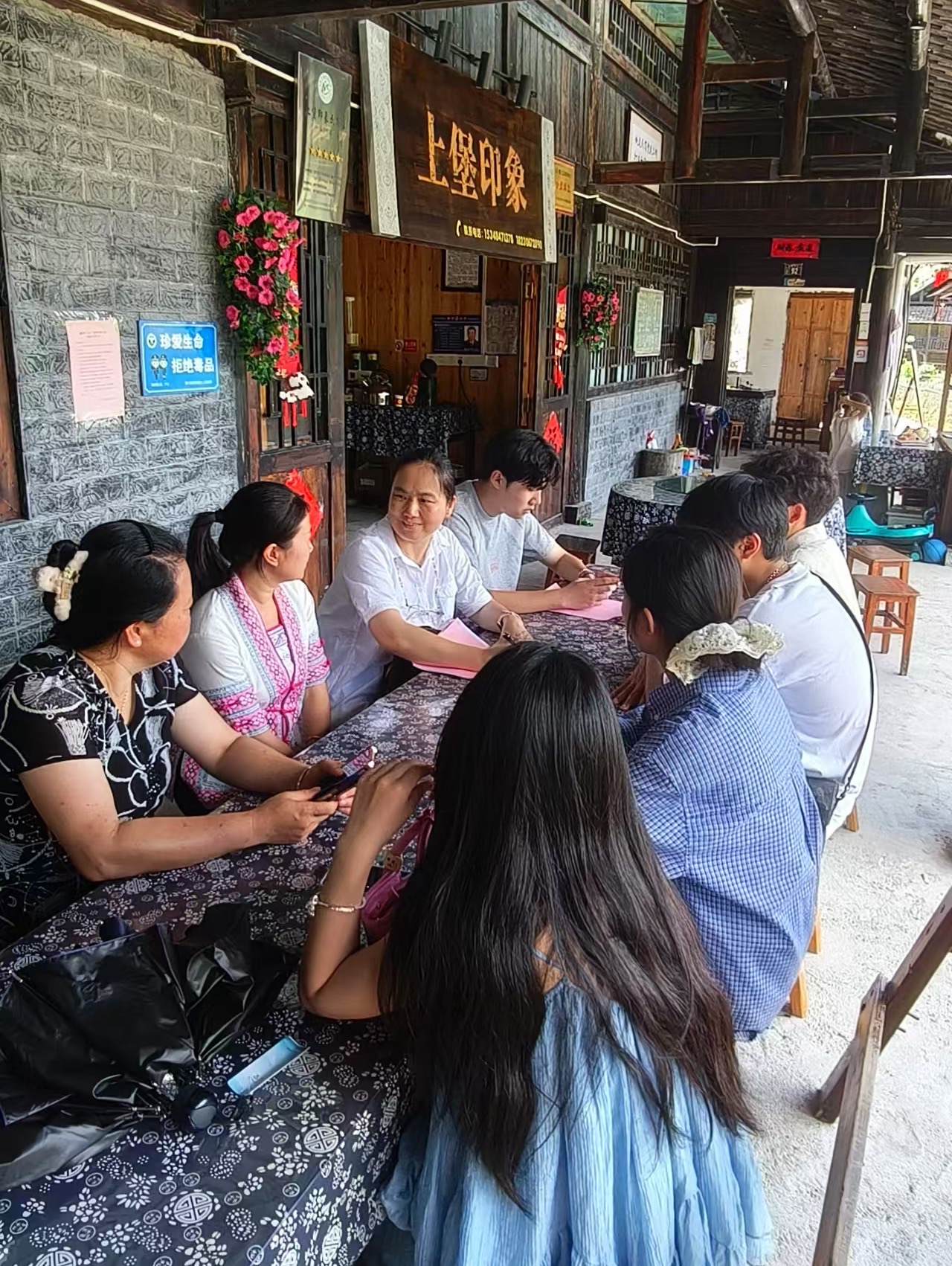 走进那家由吊脚楼改造的民宿,木质结构散发着淡淡的松木香,美人靠上的雕花纹路被岁月磨得发亮。经营者苗族大哥正坐在堂屋整理游客留言本,见队员们来了,连忙起身招呼。他坦言,民宿的特色体验很受欢迎——客人能跟着苗家阿妈学做酸汤鱼,能跟着他上山认草药,但旺季一过就冷清,线上也没什么人知道。队员们翻看留言本时发现,不少游客夸“夜景美”“饭菜香”,便提议:“大哥,咱们把客人拍的夜景视频、围坐吃酸汤鱼的热闹场景剪一剪,发在抖音上,再挂个‘苗寨住宿+晚餐’的团购链接,肯定能吸引更多人。”还主动提出帮他调试客房Wi-Fi,“让客人住得舒服,自然愿意帮您宣传”。大哥听着,手里的笔在本子上记个不停,眼里满是期待。