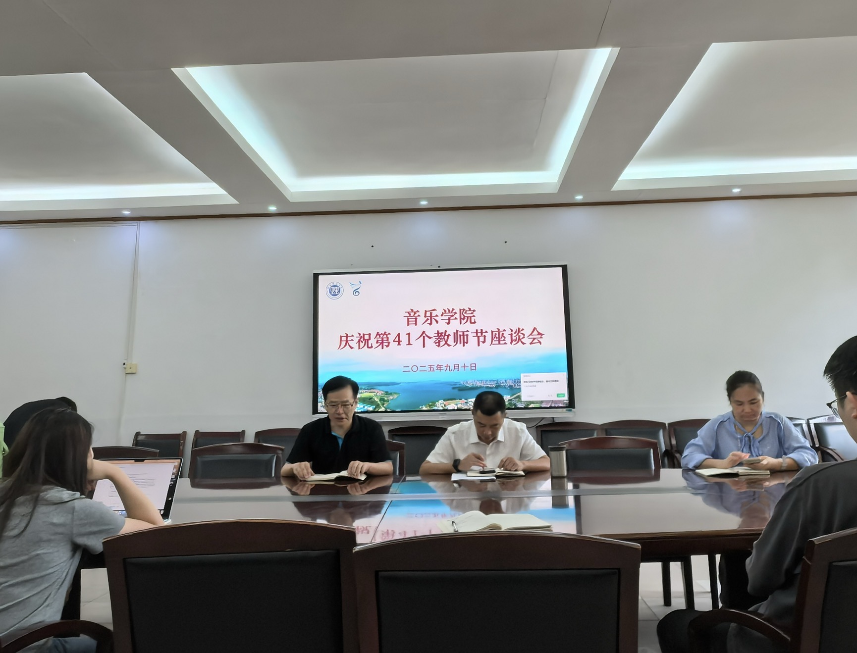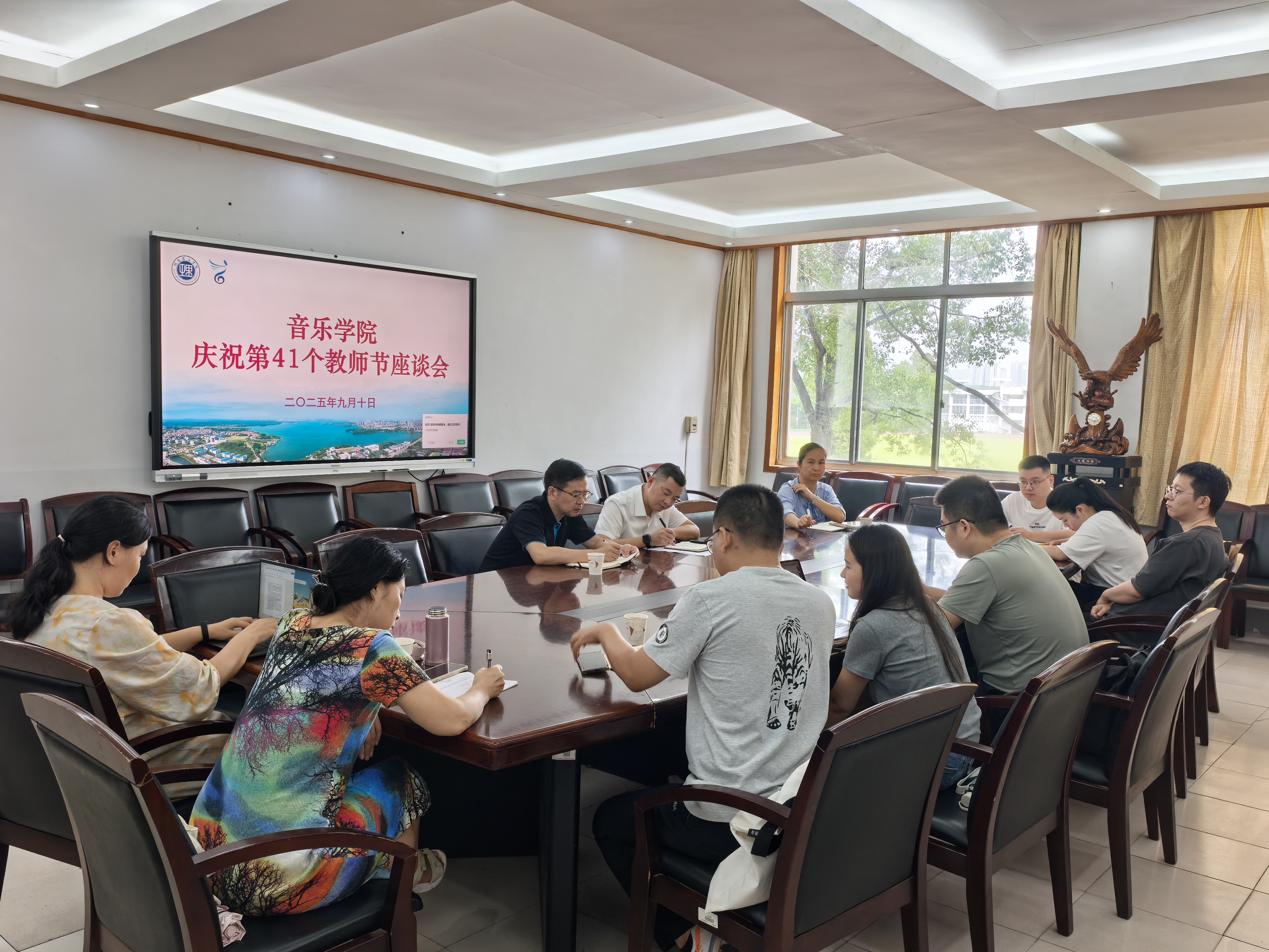 2025年9月10日上午,beat365手机版官网入口在大会议室召开庆祝第41个教师节座谈会。会议由主持行政工作的庞毅副经理主持,主持党委工作的副书记喻俊、党委副书记蔡奕、各教研室教师代表参加。与会教师以“教师与公司、公司相融合、共发展”为主题,围绕教学科研协同发展、学科融合创新、人工智能赋能艺术教育等议题展开热烈讨论。