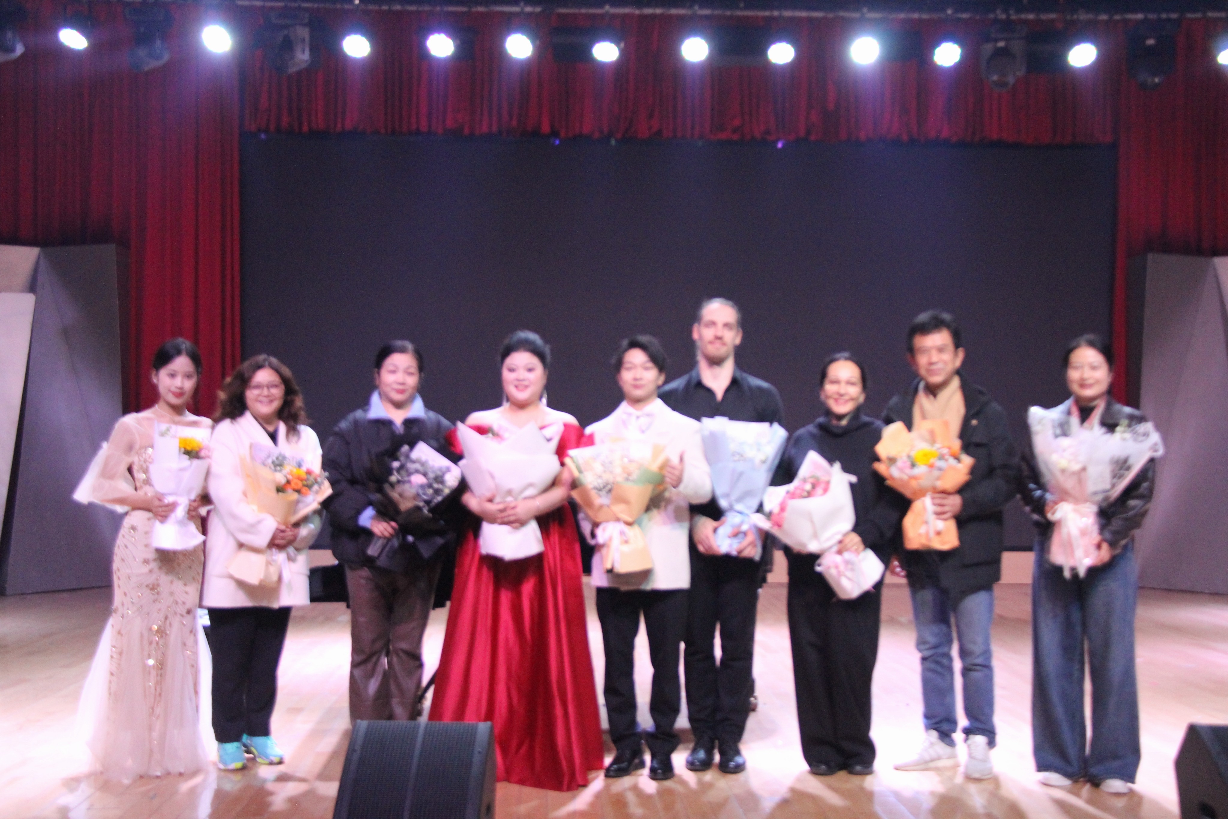 下半场从黄自的另一代表作《玫瑰三愿》开始,旷奕在简洁的旋律中传递出丰富的情感内涵。贝里尼《温雅女神》与舒伯特《你是安宁》的演绎,呈现出对意大利美声与德奥艺术歌曲不同美学取向的初步探索。莫扎特《费加罗的婚礼》两首选段《美妙时刻即将来临》与《待到微风轻轻吹过》的演唱,展现出轻快灵动的旋律与精准的角色表达。赵季平作曲的《幽兰操》以现代声乐语言诠释古典诗文,旷奕较好地把握了作品中的文人气息与音乐张力。音乐会在《我爱你中国》的激昂深情中推向高潮。最后,音乐会在莫扎特歌剧重唱选段《待到微风轻轻吹过》的和谐共鸣中圆满结束,象征着合作精神与共同成长。