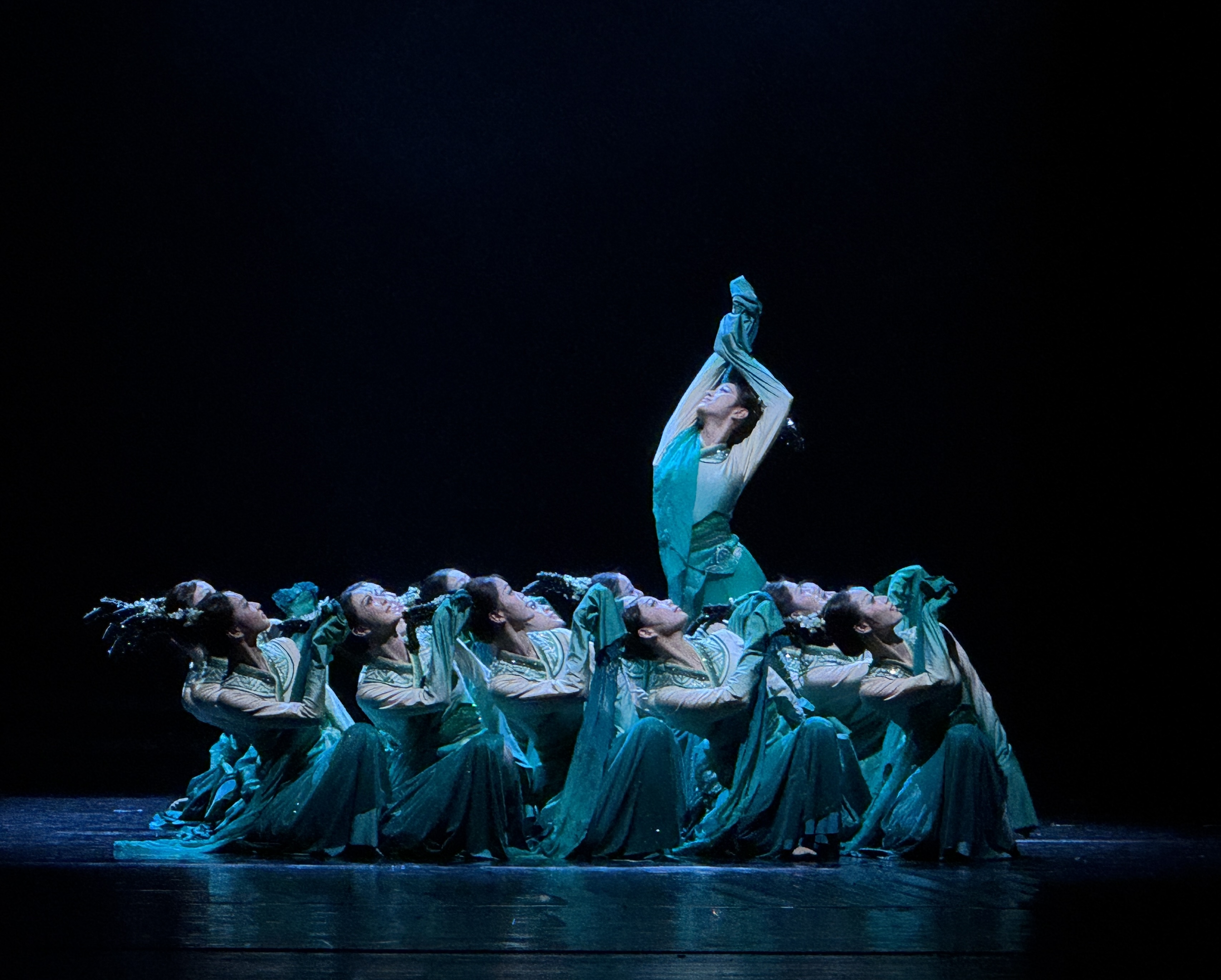 在视觉呈现上,舞者手持青绿渐变的飘逸短纱,随着身体的旋转与舞动,薄纱轻扬,时而如茶烟袅袅升腾,时而似洞庭湖上晨雾弥漫,营造出“杯中叶影舞,空中翠烟生”的诗意画卷。这一设计不仅强化了作品的视觉效果,更精准传递出君山银针“形如群笋出土,状似银刀林立”的形神之美,实现了自然意象与身体表达的完美交融。