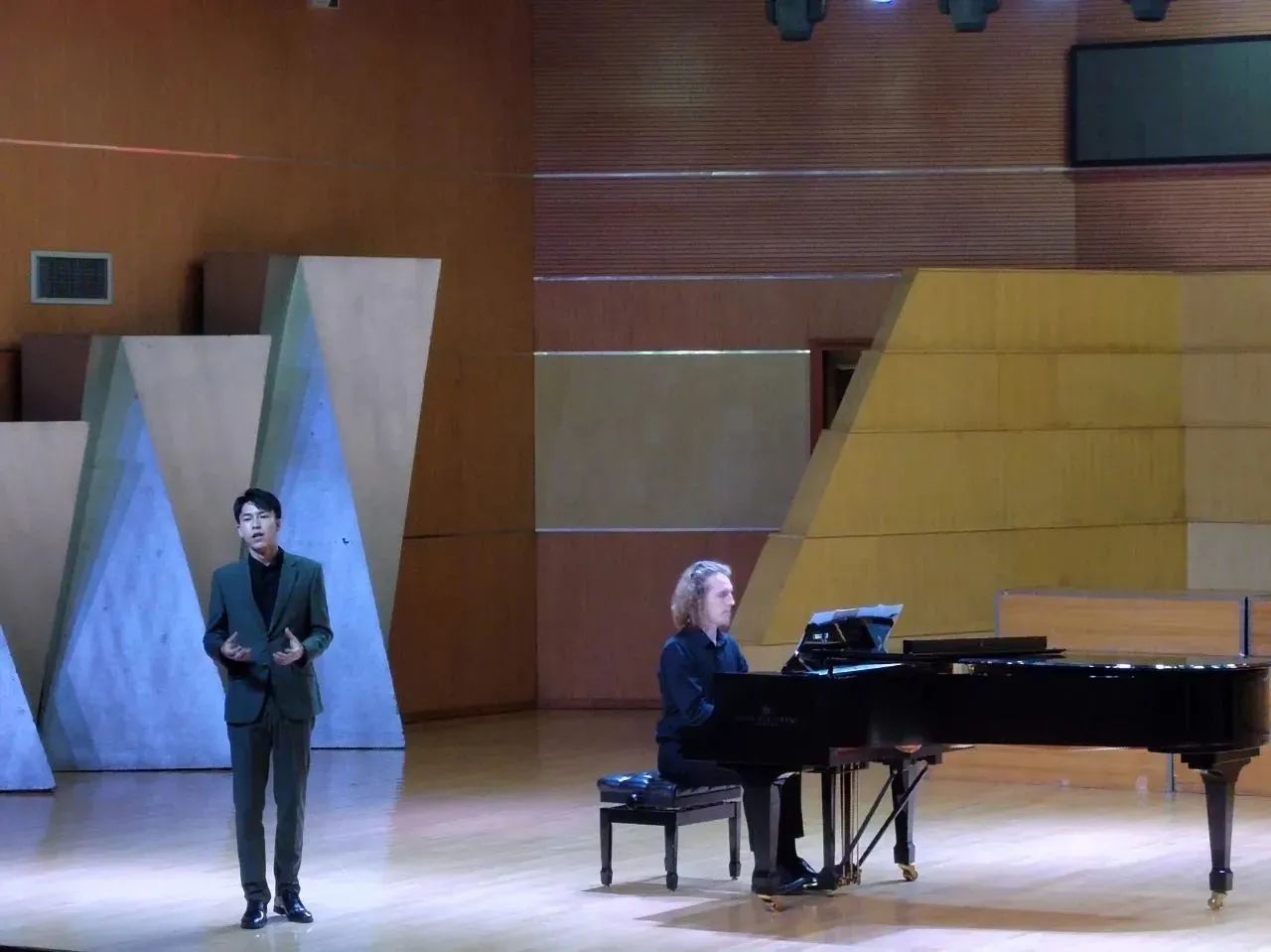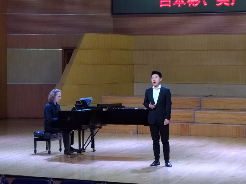 音乐会的开场在白本彬带来的一首咏叹调《绿树成荫》中拉开帷幕,他饱含深情的演绎将现场观众们一同带入到满眼苍翠的美景当中,让人倍感轻松愉悦。接下来又由白本彬、吴广思两人先后演唱了《多情的土地》《宛如阳光》《这是一份誓言》《快给大忙人让路》《我爱你》等音乐作品,他们用扎实的基本功和丰富的情感向观众们诠释着这些艺术作品的内涵,将独属于他们个人的演唱风格展现得淋漓尽致,令现场观众们呼声不断。他们所演唱的多部中外歌剧作品,为同学们带了良好的学习示范,更为现场师生带来了一场视听盛宴。最后,两人共同演唱了一曲《往日时光》,为本次音乐会画上了一个圆满的句号。