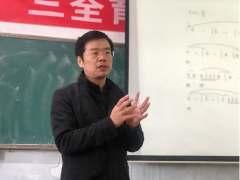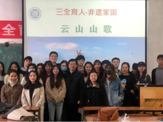 课上,庞毅副经理给同学们从云山山歌的概况、云山山歌的题材类型、云山山歌的音乐特征三个方面为我们介绍了云山山歌。并且重点介绍了云山山歌的5种题材,分别是情歌型、调侃型、调剂型、劝歌型和时代歌。其歌词通俗上口,易懂,易记,易传。曲调多为五声徵调式,旋律低音区抒情,婉转,高音区热烈,高亢,节奏自由,多为散板,句式结构有两句,三句,四句,五句多种形式,尤以五句见多。演唱时由低到高,高音区多用假嗓演唱,音域宽广,音色明亮,穿透力强,衬词运用恰到好处,结合完美。