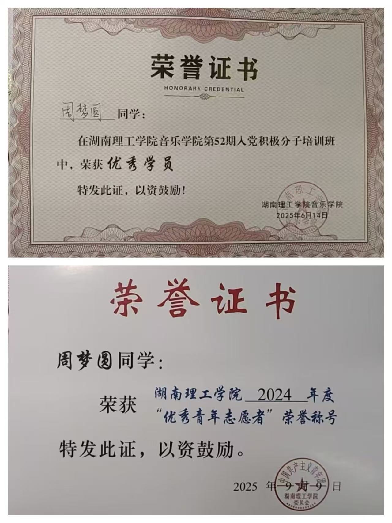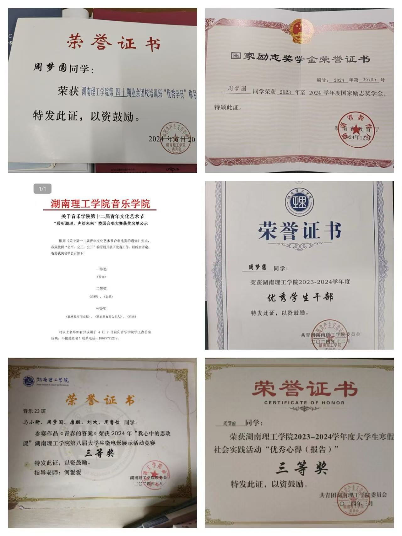 国家级、省级、校级,周梦圆同学的荣誉轨迹,是她专业深耕、综合成长的见证,也成了精进音乐技艺的底气。她持续的坚守与奋进,终将让每一份付出都化作照亮前路的荣光,为逐梦者写下“功不唐捐”的注脚。