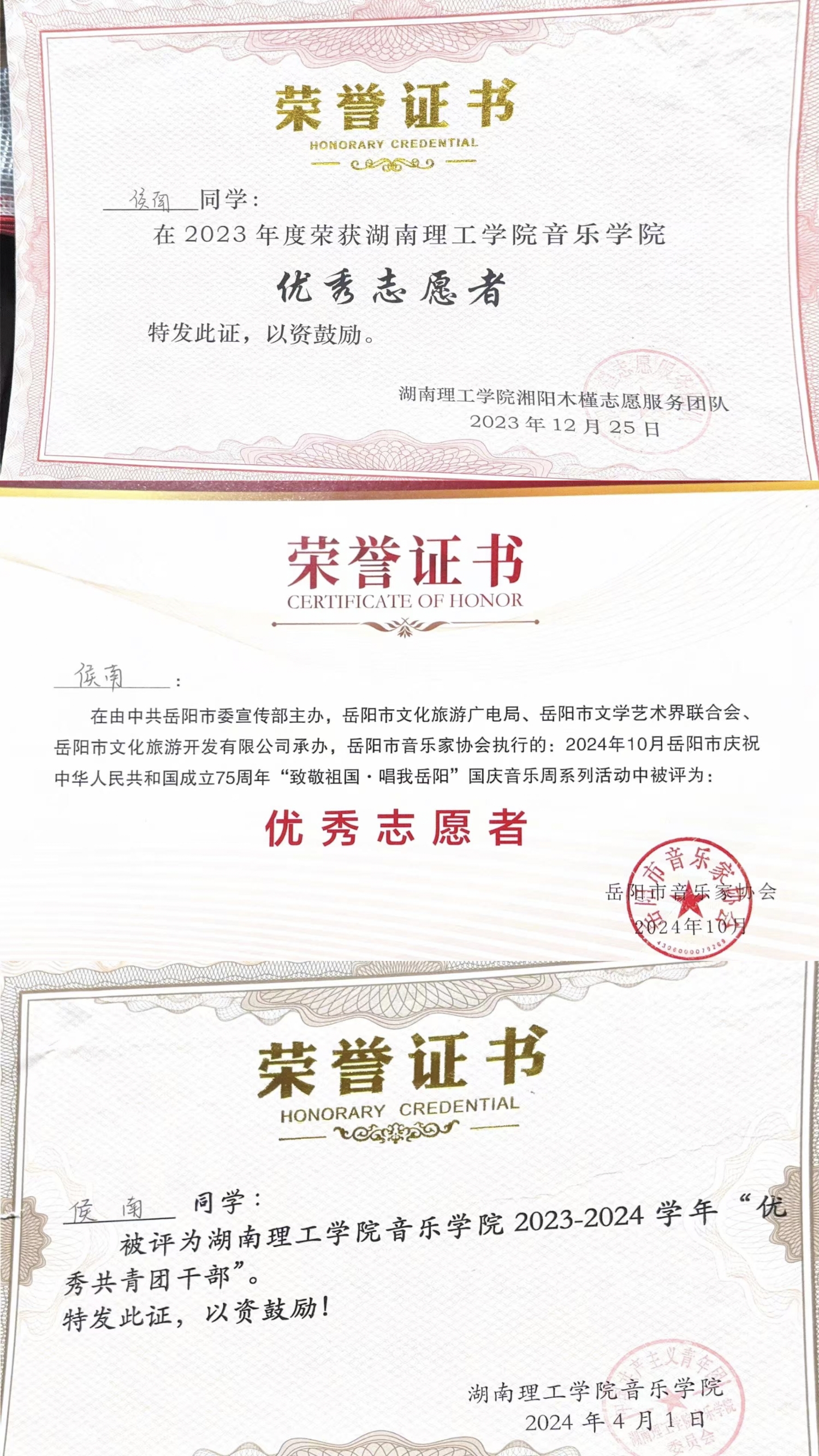 志愿服务实践时,他始终以爱为翼,在奉献中传递温暖与力量。作为洞庭渔歌传承志愿服务团队核心成员,他带着对非遗的热爱走进课堂,开展6场“渔歌进课堂”、10余次“声韵寻踪”教学,参与“省非遗联展”,累计服务超1200人;作为湘阳木槿志愿服务团队成员,他深耕特殊儿童关怀、敬老服务与社区公益,开展近10场“守望特殊家庭”等活动,多次赴颐养院陪伴老人、协助康复咨询,累计志愿时长421小时。从市级“最美志愿者”到校级“优秀青年志愿者”,一张张证书见证着他的坚守,也让他读懂志愿服务的真谛:“把微光汇聚,就能照亮他人的前行之路”。