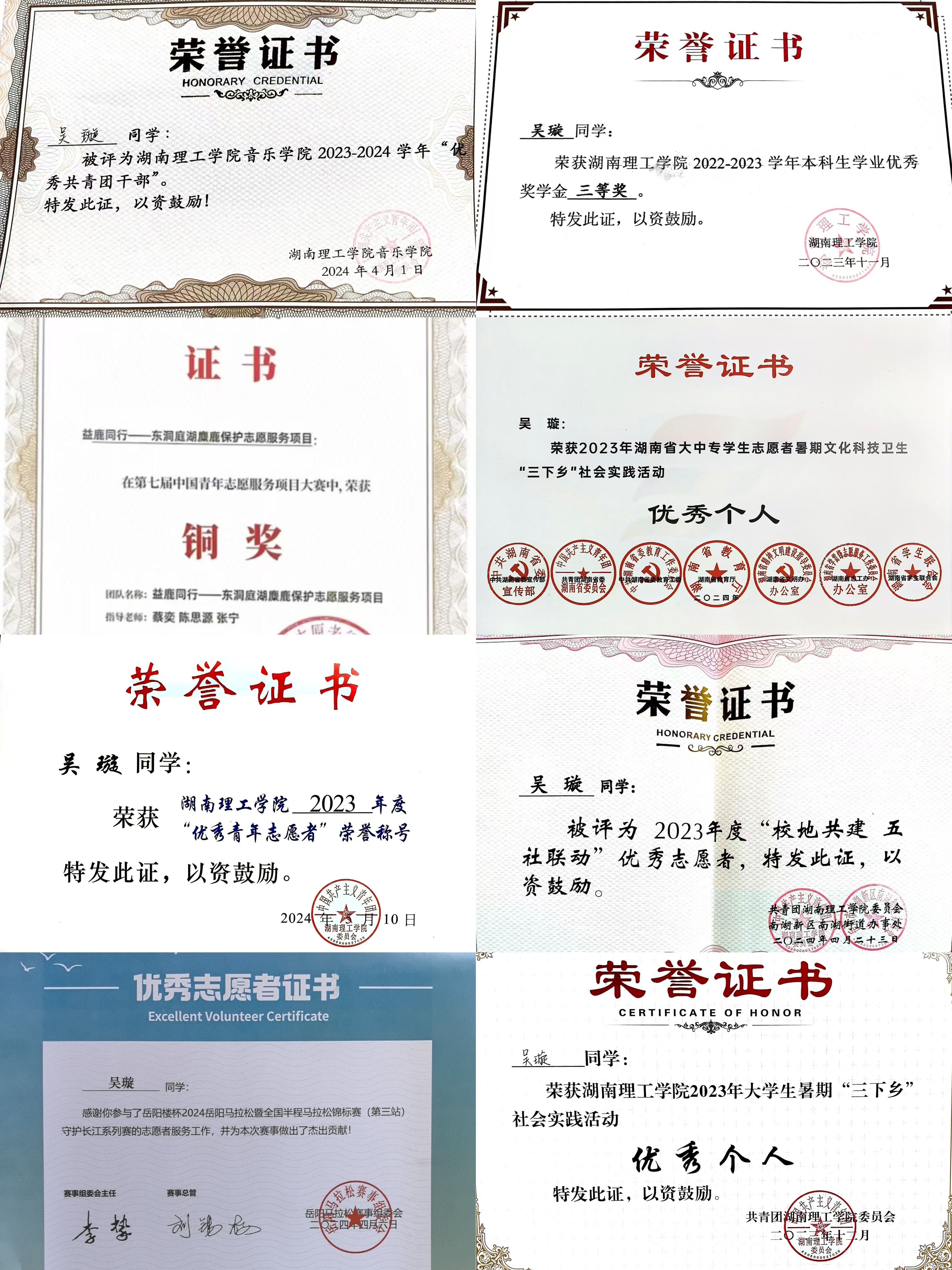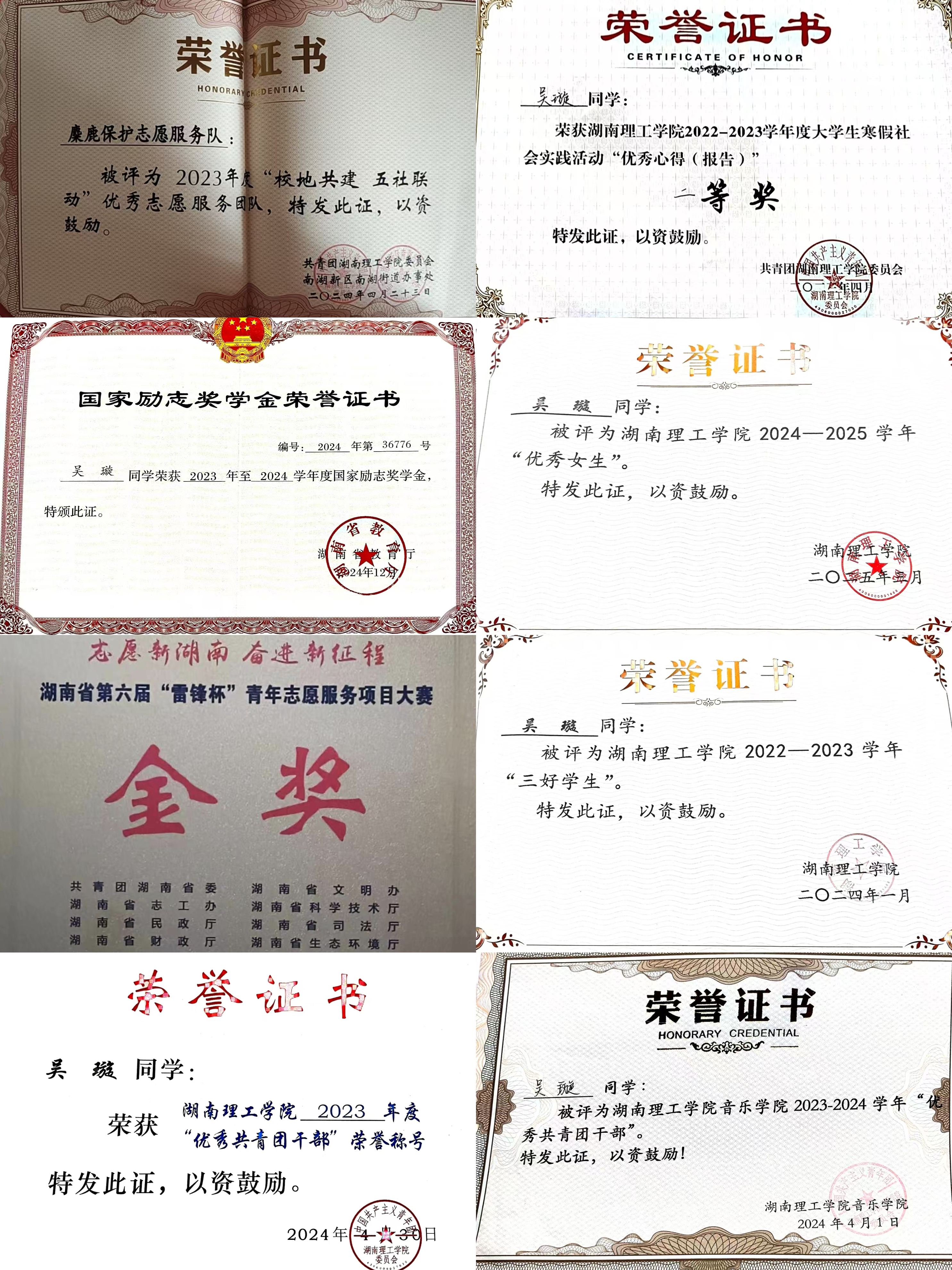 学业与实践并行,成长与荣誉相伴。吴璇连续两年斩获国家励志奖学金,荣获校级本科生学业奖学金;个人综合素质全面发展,先后获评“优秀女生”“三好学习标兵”“优秀共青团干部”“三好员工”“优秀青年志愿者”等多项荣誉称号。实践心得屡获佳绩,两次分获校级寒假社会实践“优秀心得(报告)”一、二等奖,两次获评省、校级暑期“三下乡”社会实践优秀个人,用实打实的成绩证明“实践与学业可以双向奔赴”。