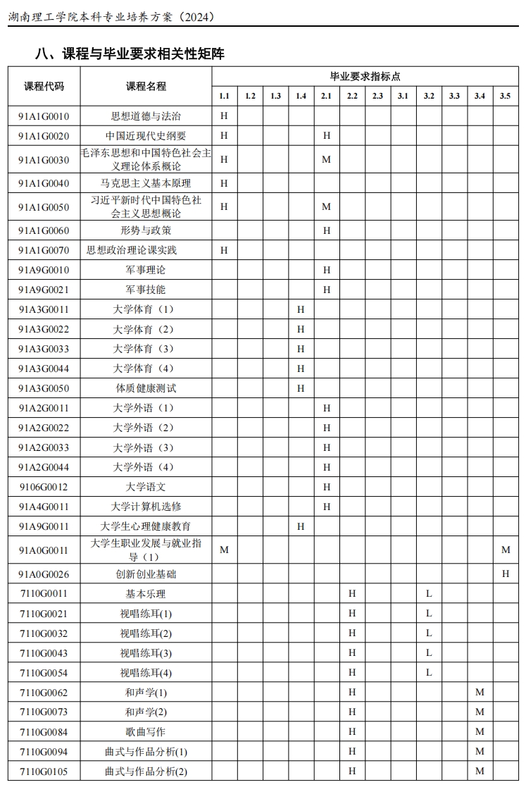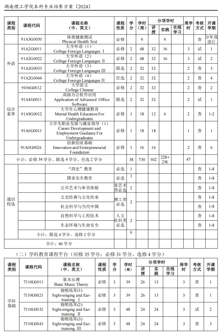 基础钢琴(2)、基础声乐(2)、视唱练耳(4)、和声学(2)、歌曲写作、曲式与作品分析