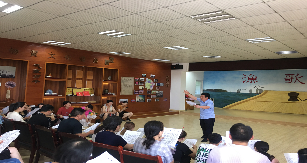 在渔歌教唱环节,陈岳林先生带领全体师生,现场学唱了《我的渔歌千千万》《盘歌》两首久经传唱的传统渔歌。在学唱的过程中,全体成员深深体验到了洞庭渔歌特有的音乐文化韵味,进一步了解了洞庭的演唱风格,感受了洞庭渔歌独特的艺术魅力。