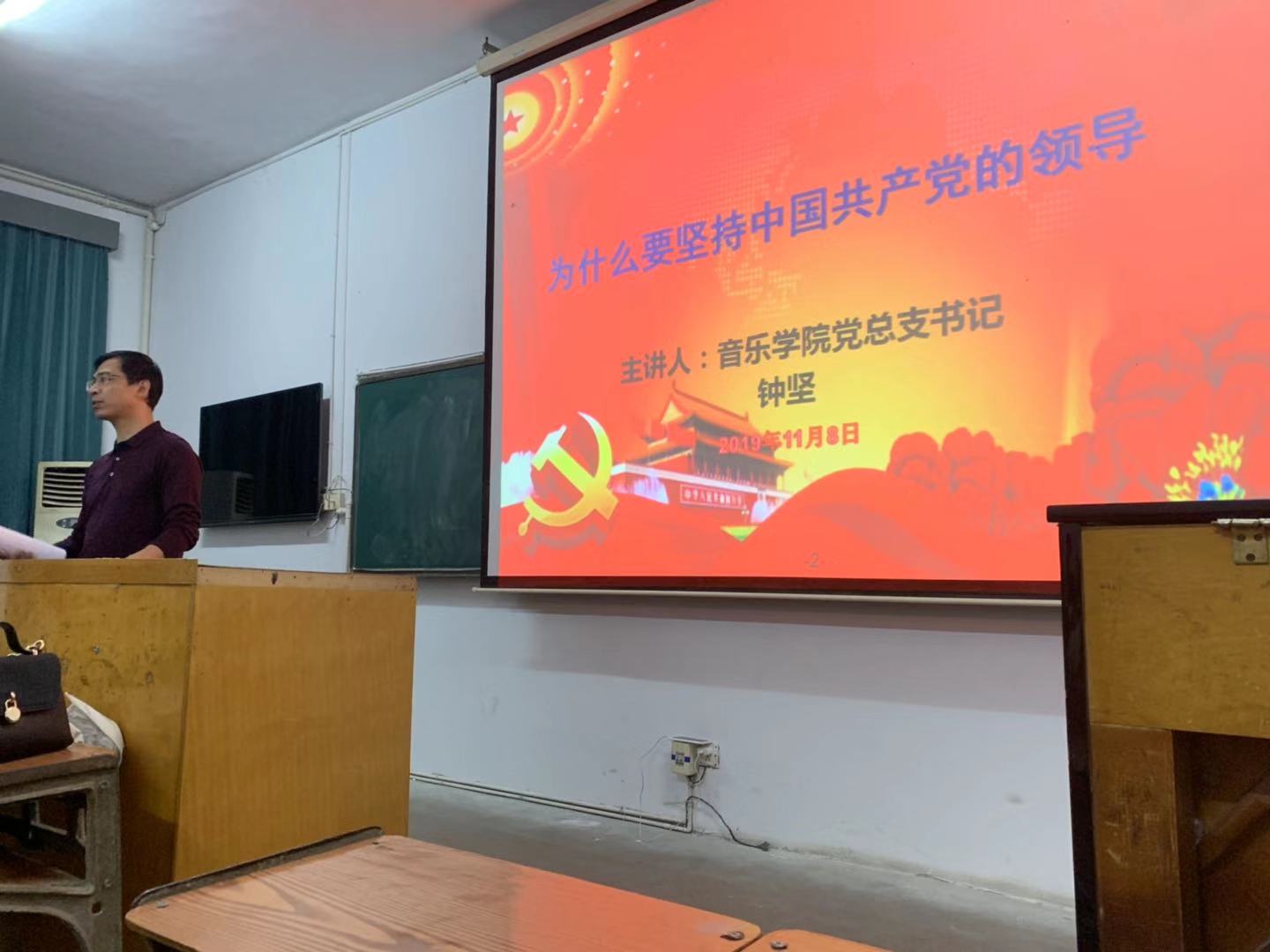 2019年11月8日晚7点30,公司党总支副书记钟坚老师以“为什么要坚持中国共产党的领导”为题在beat365手机版官网入口4111教室讲授专题党课。公司本科、研究生党员,以及所有第41期入党积极分子现场聆听。