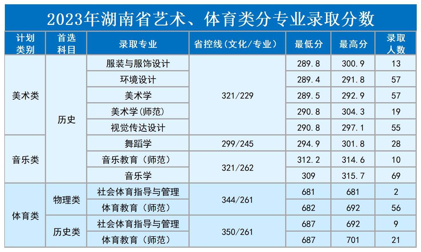 注:1以上分数均来自湖南省第一次投档分数: 2艺术类录取依据考生文化和专业统考的综合成绩排序,由高往低依次录取(综合成绩=文化*30%+专业统考成绩*70%);3湖南省体育类考生按文化+专业统考分的综合成绩从高到低依次录取。若综合成绩相同则专业统考成绩高者优先录取。
