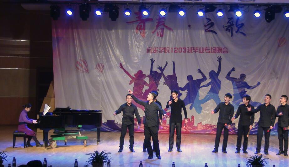 柳青(左一)在员工毕业专场晚会上为员工伴奏
